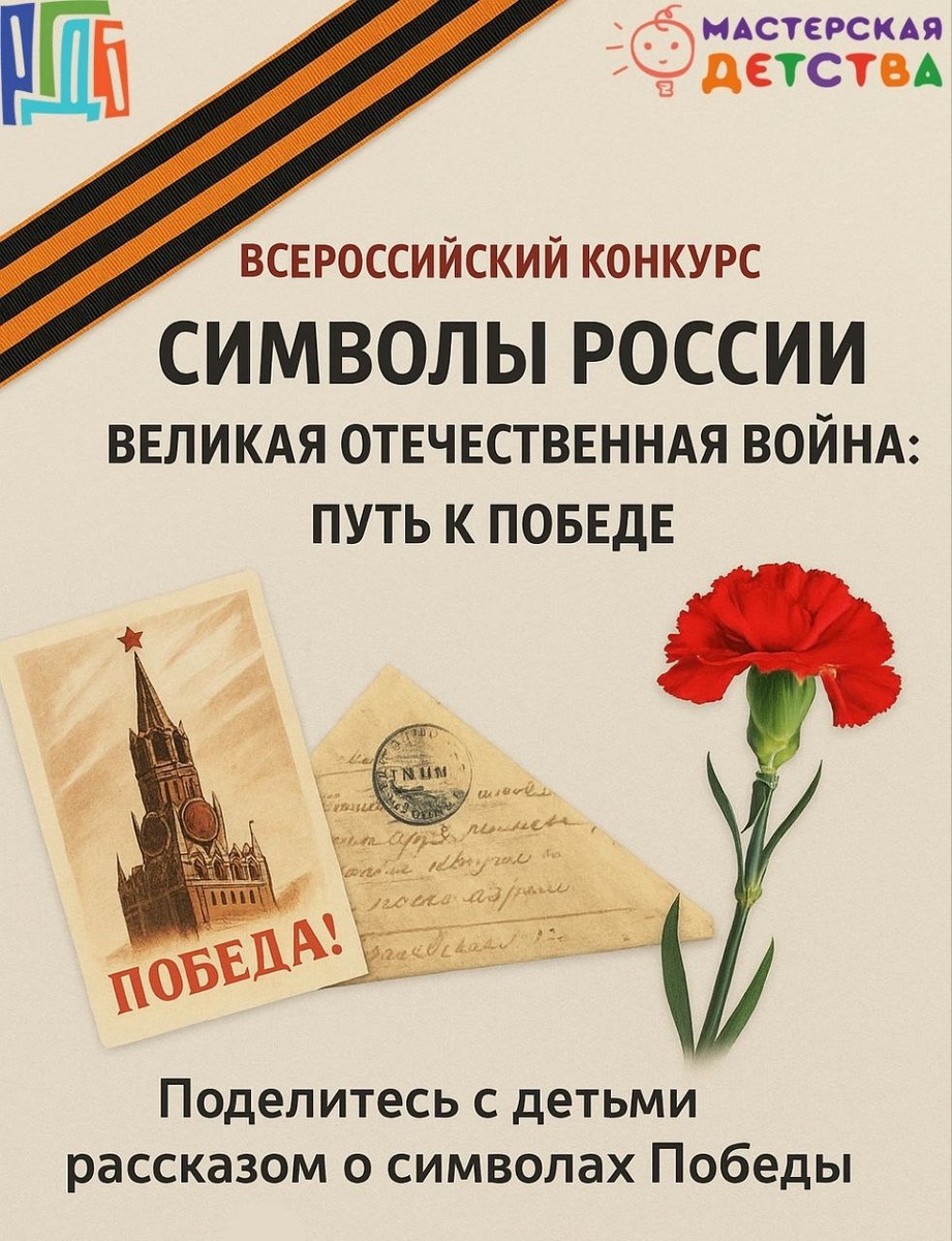 ✉️Всероссийский конкурс «Символы России. Великая Отечественная война: Путь к Победе» Что мы знаем о символах Победы? Георгиевская лента, фронтовые письма-треугольники, военные песни, памятники и музеи — всё это часть истории, которую мы передаём детям. 📌Конкурс «Символы России» — это шанс вспомнить подвиг наших предков и вместе с детьми поговорить о важных страницах прошлого. ✴️ Участвовать могут семьи, воспитатели и педагоги — конкурс направлен на сохранение исторической памяти и патриотическое воспитание. На сайте Российской государственной детской библиотеки уже доступны все подробности 🔗 Узнать о конкурсе clck.ru/3MxaEr ✨ Присоединяйтесь, участвуйте с детьми, ведь именно мы формируем связь поколений и помогаем маленьким гражданам России гордиться своей историей. #СимволыРоссии #МастерскаяДетства