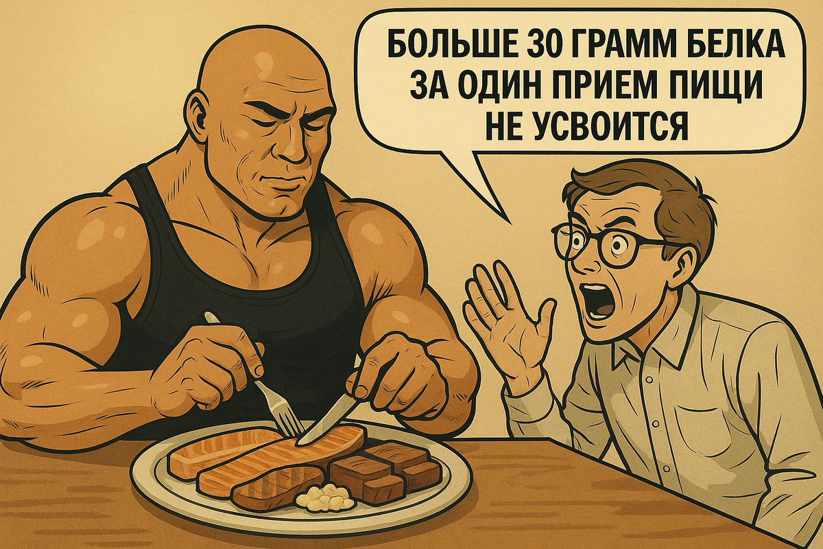 Этот вопрос особенно волнует тренирующихся. Скажу сразу — это не соответствует действительности. Этот стереотип появился благодаря исследованиям, которые показали, что потребление более 20 грамм белка за раз повышает синтез мышечного белка, а 40 грамм не даёт значимого увеличения синтеза по сравнению с 20 граммами. Поэтому возникло мнение, что до 30 грамм — оптимально. Сразу представляю наших предков, бегущих по саванне, которые намеренно недоели антилопу, потому что «всё равно столько белка не усвоится». Ну бред же — ели как в последний раз, чем больше, тем лучше. Ведь неизвестно, когда ещё удастся поесть. Выжили, эволюционировали, а теперь сидим и читаем посты в соцсетях. Едем дальше. В этих исследованиях много неучтенного Синтез белка рассмотрели, а распад — нет, а это тоже важный параметр для мышц. К тому же дизайн тренировок в этих работах был слабый — одна мышечная группа в небольшом объёме. В других исследованиях это учли — и уже приём 40 грамм показал преимущество в си