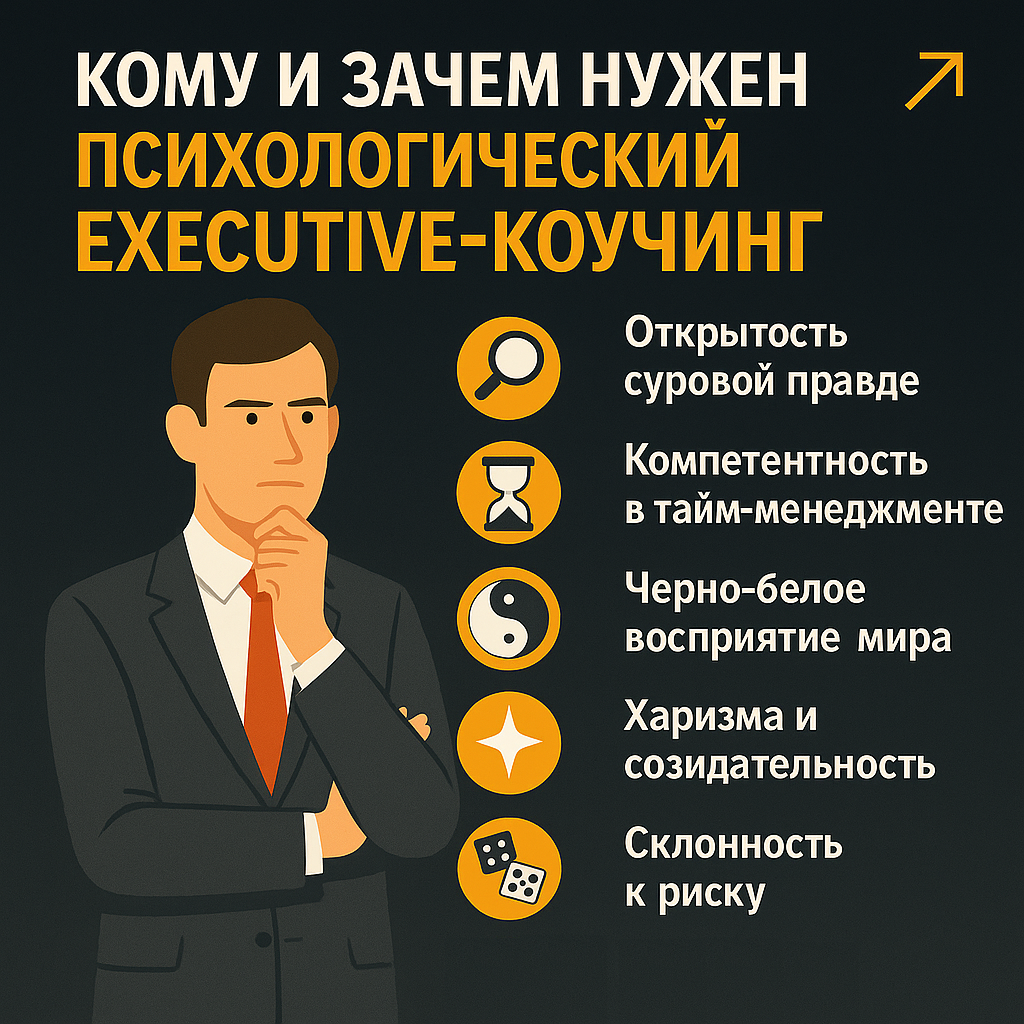 Executive-коучинг — это не про «помощь тем, у кого проблемы». Это инструмент, который выбирают сильные. Те, кто уже добился многого, но не останавливается в развитии. Коуч работает с лидерами: собственниками бизнеса, топ-менеджерами, публичными фигурами — с теми, кто принимает решения, влияет на процессы и несёт ответственность за результат. Чаще всего — это «первые лица»: успешные, амбициозные и перегруженные одновременно. Им свойственны: Всё это формирует силу, но одновременно — уязвимость. Даже самые успешные сталкиваются с: Лидеры постоянно ищут точки роста. Коучинг — это возможность взглянуть на себя, решения и стратегию под новым углом. Рядом часто нет никого, кто может говорить честно, без фрейма подчинённого или польщённого окружения. Коуч — это тот, кто не восхищается, а помогает ви