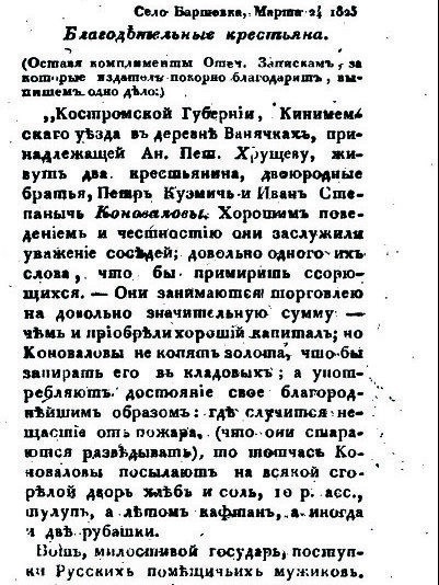 Сто событий ДО образования города (1823-1925). #1 - 1823, 24 марта (5 апреля) - Князь А.Д. Козловский написал небольшую заметку, которая была опубликована в июньском номере журнала «Отечественные записки», о «благодетельных крестьянах» из деревни Вонячки, двоюродных братьях Петре Кузмиче и Иване Степаныче Коноваловых, которые «занимаются торговлею на довольно значительную сумму» и щедро тратят свои средства на благотворительность, помогая нуждающимся. С этой публикацией зародилось вичугское краеведение. Следует заметить, что в этой публикации не упомянуто, что у Коноваловых было какое-либо фабричное заведение. Утверждение самих Коноваловых, что они основали свою фирму в 1812 году, является, говоря по-современному, фейком, у которого своя интересная история, о которой мы ещё будем говорить.