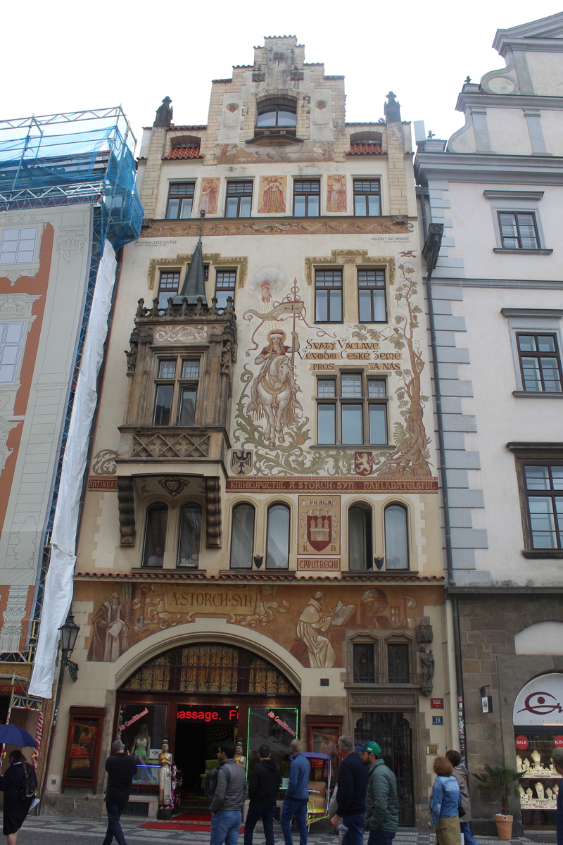 Каждый дом на Староместской площади Праги по своему красив, у каждого есть своя история. Но дом со святым Вацлавом и аистами, Шторхов дом (Štorchův dům), стоящий на южной части площади, обязательно привлекает к себе внимание. Ранее этот текст был на канале в формате поста. Я его переработал - немного расширил, добавил фотографии. Построили его не очень давно, в 1896-97 годах. Здание, которое стояло на этом месте раньше, частично использовали для создания нового дома. Оно называлось "У каменной Девы Марии", поэтому и новый дом порой называют так же. Над входом можно увидеть каменную Деву Марию с младенцем, которая тоже напоминает об этом названии. Заказчиком строительства был книгоиздатель Александр Шторх, и он специально оговорил, что дом должен выглядеть в духе готики. Поэтому и кажется, будто он совсем из другой эпохи. Но эркер, выступающий из фасада, действительно оставили от предыдущего здания. Весь фасад дома покрывают фрески. Они созданы по эскизам знаменитого Миколаша Алеша (ра