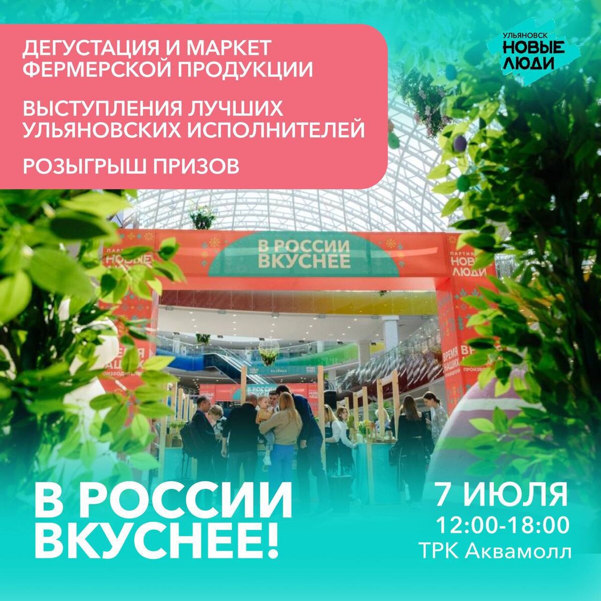 Ярмарка «В России вкуснее» 🗓️ 7 июля, 12:00-18:00 📍 ТРК Аквамолл 12:00-14:00 — бесплатная дегустация 14:00-18:00 — развлекательная программа, голосование и розыгрыш подарков Что вас ждет? ▪️Бесплатная дегустация фермерской продукции ▪️Выступления лучших ульяновских исполнителей ▪️Весёлые интерактивы и увлекательные конкурсы ▪️Розыгрыш ценных призов ▪️Маркет фермерских продуктов по специальным ценам 🏷️ вход свободный