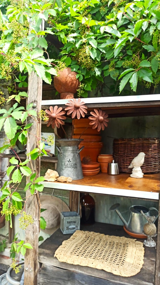 Стоило чуть передохнуть от бешенной нагрузки, и вот захотелось сделать что-то для себя) Вновь вернулась к оформлению "Уголка садовника" на нашем участке... За время заброшенности (5 лет!!!) он по-настоящему завинтажился, его облюбовала наша кошка. Я не возражаю, подстилочка на полке для неё) Конечно, объекты еще буду передвигать-переставлять, добавлять-убирать, даже во время фотографирования двигала немного.. Но спешу поделиться первой итерацией)))