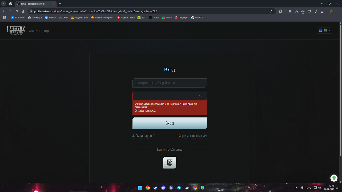 Приветствую всех читающих эту статью, хочу рассказать вам свою историю о том как я выставил свой аккаунт от игры Escape From Tarkov с изданием Edge of Darkness на продажу, но покупателя так и не нашлось (хотя к сведению прошло где-то месяца 2). В какой-то прекрасный день, мне захотелось поиграть в эту "чудо" игру, но не тут то было, при попытке авторизации вылезла данная ошибка, а точнее сообщение о том что учётная запись заблокирована за нарушение лицензионного соглашения. После чего я не долго думая решил обратиться в поддержку, для уточнения причины блокировки, сначала решил написать в чат сообщества ВКонтакте, на что ответ был таким - "Здравствуйте! По данному вопросу, пожалуйста, обратитесь в службу поддержки игры по адресу: support@battlestategames.com" После чего они благополучно закинули меня в Чёрный список своего сообщества, честно мне стало даже смешно с той ситуации что они так заморачиваются чтобы я даже не мог смотреть их сообщество. Ладно, подумал я, обращусь на почту