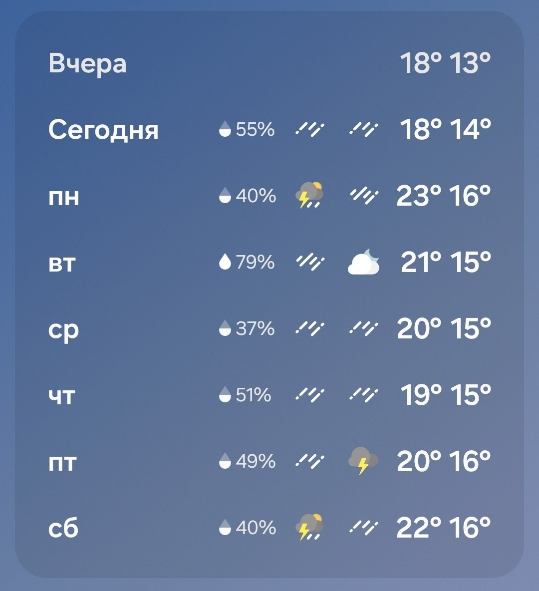 Синоптики сообщают, что в ближайшие дни в Санкт-Петербурге жары не предвидится Более того, в течение всей рабочей недели ожидаются значительные дожди. Температура воздуха будет держаться в пределах 20–23 градусов. ДТП и ЧП Кудрово