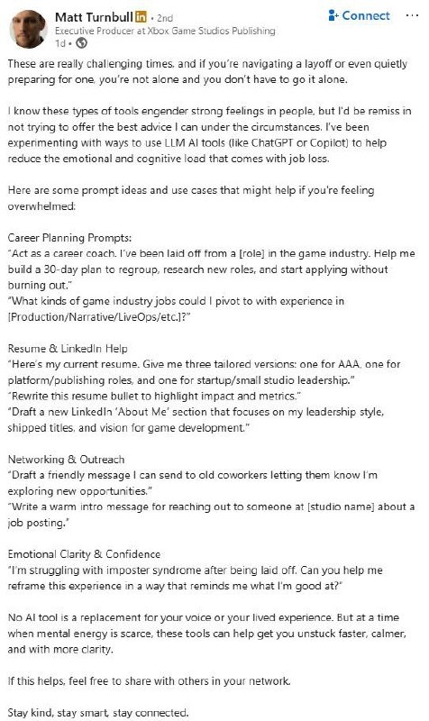 Xbox советует уволенным обращаться к ИИ: как искусственный интеллект меняет не только игры, но и судьбы разработчиков В последние месяцы индустрия видеоигр сотрясается от масштабных сокращений: Microsoft объявила о новой волне увольнений, затронувшей около 9 000 сотрудников — и значительная часть потерь пришлась именно на подразделение Xbox и игровые студии компании (всё это в совокупности называется Microsoft Gaming). Это уже четвертый раунд массовых увольнений за последние полтора года, и на этот раз под удар попали как большие проекты в лице Perfect Dark и Everwild, так и целые студии, включая The Initiative. Руководство объясняет происходящее необходимостью «повысить эффективность, сократить управленческие прослойки и сфокусироваться на стратегических направлениях», но для тысяч разработчиков и креаторов это означает конец многолетней работы и неопределённость в будущем. В индустрии, где перемены происходят со скоростью света, новость от Xbox вызвала настоящий шквал обсуждений.
