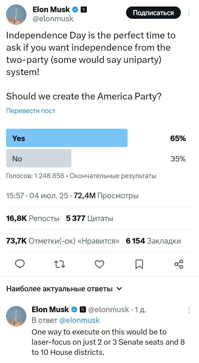 4 июля в День Независимости США Маск запустил опрос надо ли создать третью партию. За сутки с небольшим проголосовало более 1,2 млн чел. 65,4% ответили «Да». 800 тыс. человек уже готовы его поддержать. С перевесом два к одному — вы хотите новую политическую партию, и вы её получите! Когда речь идёт о разорении нашей страны расточительством и коррупцией, мы живём в системе одной партии, а не в демократии. Сегодня сформирована партия «Америка», чтобы вернуть вам свободу. Маск уже подтвердил программу партии «Америка»: ✔️ Сокращение госдолга, только ответственные расходы. ✔️ Модернизация армии с помощью ИИ и робототехники. ✔️ Поддержка технологий, ускоренное развитие ИИ ради победы. ✔️ Меньше регулирования во всех сферах, особенно в энергетике. ✔️ Свобода слова. ✔️ Поддержка рождаемости. ✔️ Центристская политика во всех остальных вопросах. На самом деле сомнительная программа. В экономике она очень уж похожа на то, что делает Трамп. Маск не собирается отменять налоговые льготы крупному