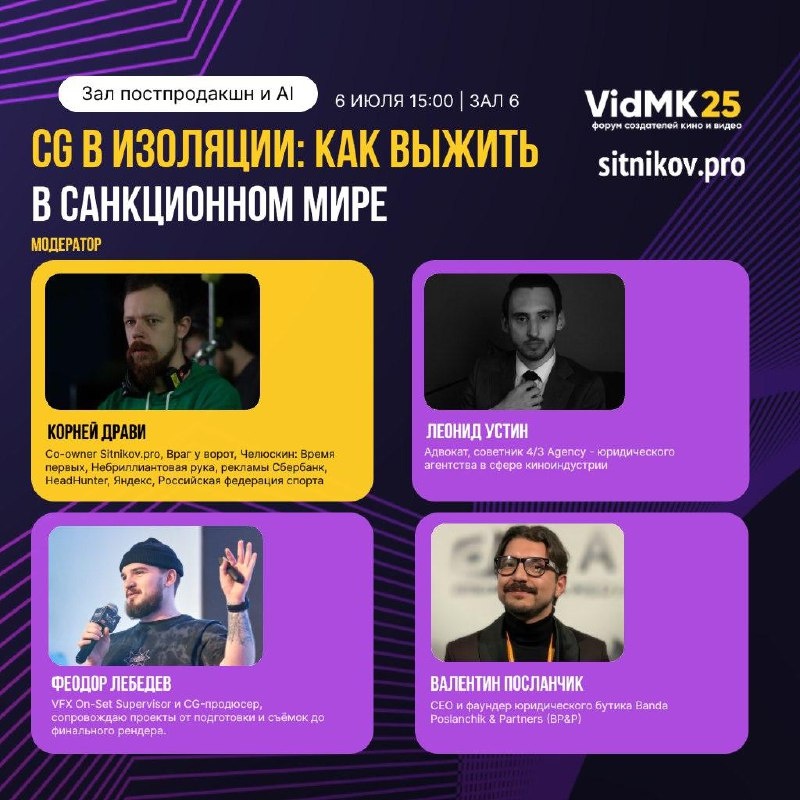 Уже сегодня мы встретимся на VidMK25 — в зале «Постпродакшн и AI», который курирует Sitnikov.pro. Три панельные дискуссии — три острых вопроса индустрии: ❗️CG в изоляции — как работать с иностранными подрядчиками и стоками в условиях санкций ❗️Сделай красиво — как упаковывать кейсы и продавать свой шоурил ❗️ ИИ — не угроза, а ассистент — как автоматизировать препрод и не потерять креатив На сцене — CG-директора, продюсеры, юристы и инженеры. Всё по делу. 📍 Зал 6. Начинаем в 15:00. Ждём! vidmk.ru