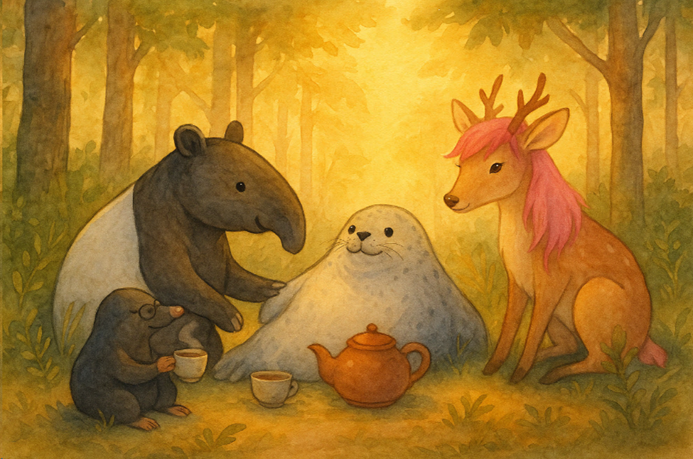 Тапир и Кротон шли по старой тропе, которая вела от «ничего особенного» к «где-то там». Это был день без особого плана, но с термосом чая и легкой радостью в походке. — Кажется, сегодня идеальный день, чтобы не знать, куда идёшь, — сказал Тапир. — И всё равно туда прийти, — кивнул Кротон. Вдруг тропа прервалась. Прямо посреди дороги лежал огромный, округлый, серый камень. Он был гладкий, прохладный на вид и неестественно симметричный, будто не лесом порождённый, а подброшенный сюжетом. — Это тут не лежало, — заметил Тапир. — Это и лежать не должно. Это не местный камень, — добавил Кротон. ________________________________________ Они попытались его подвинуть. Сначала вдвоём. Потом с помощью палки. Потом Тапир позвал Косулю Сосулю и Гуся Нажруся. Все толкали. Камень слегка покачивался… А потом вздрогнул. — Он живой?! — выдохнула Косуля. — Он обиделся?! — крикнул Гусь и спрятался за шишку. Камень зашевелился. Приподнялся. Показал два уха. Два глаза. Усы. Это был тюлень. __________________