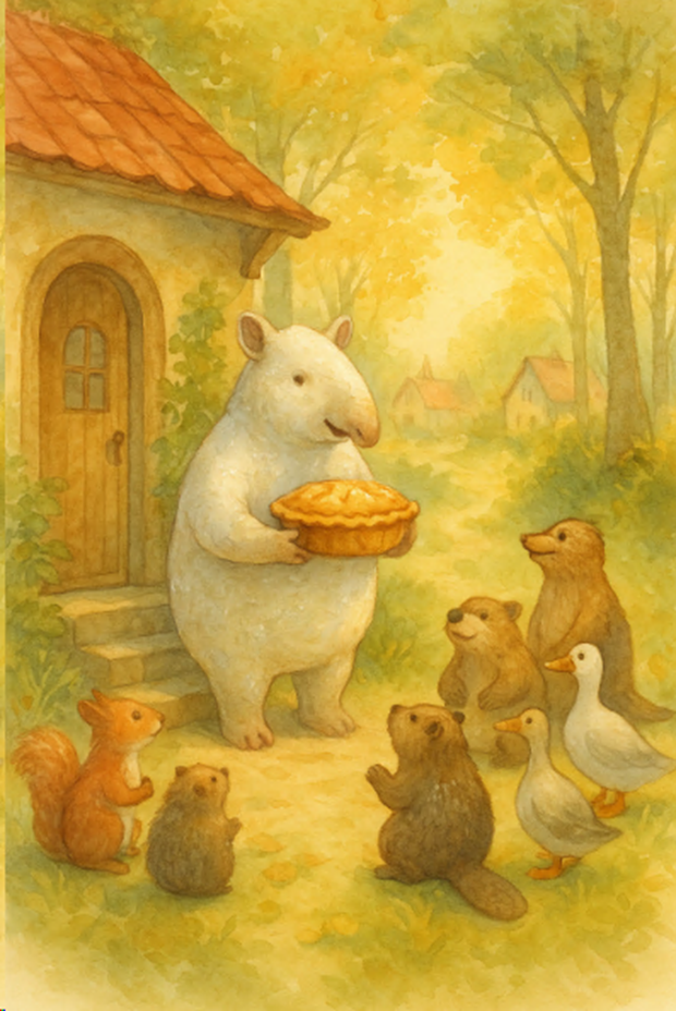 Однажды Тапир проснулся с ясной, громкой мыслью: — Хочу пирогов. Сам испеку. Он надел передник, открыл рецепты, достал миску, и начал месить. Мука взлетала туманами, липла к ушам, оседала на бочках. К моменту, когда тесто стояло отдыхать, сам Тапир выглядел как существо снежной природы. — Так. Теперь — яблоки, — пробормотал он, выходя во двор. И тут началось. ________________________________________ — Он вышел! — прошептала Белка из дупла. — Кто? — уточнил Скворец. — Белый Тапир. — Я думала, это легенда! — Да я его ВИДЕЛ! К вечеру новость уже разлетелась по Лесбуку и Бревнораме: "В чащобе появился редкий белый тапир. Благословение леса? Призрак пирога? Или шаман?" ________________________________________ На следующий день у калитки Тапира собрались: • три выдры с просьбой благословить их на любовь • ёж, который хотел узнать своё предназначение • бобёр с просьбой осветить плотину Тапир вышел с яблоками. Молчал. Смотрел удивлённо, но благосклонно. Все подумали, что это знак. Кто-то начал