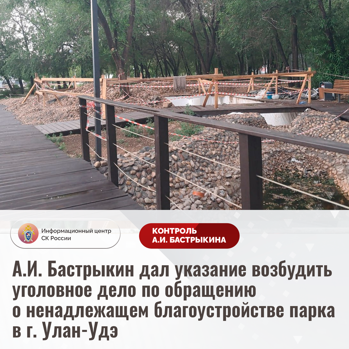 А.И. Бастрыкин дал указание возбудить уголовное дело по обращению о ненадлежащем благоустройстве парка в г. Улан-Удэ В комментариях в телеграм-канале Информационного центра СК России опубликовано обращение по вопросу ненадлежащего благоустройства парка «Мемориал Победы» в городе Улан-Удэ, для проведения которого в рамках реализации федерального проекта была выделена значительная сумма средств. В ходе выполнения работ допущены многочисленные нарушения: система водоотведения отсутствует, объем высаженных зеленых насаждений, обустроенных пешеходных дорожек и установленных декоративных элементов не соответствует проектной документации, пруд не введен в эксплуатацию. Кроме того, из-за использования некачественных материалов в настоящее время конструкции амфитеатра деформировались и стали разрушаться, в них появились глубокие трещины. Несмотря на указанное, в декабре прошлого года был подписан акт приемки объекта. Многочисленные обращения граждан в различные инстанции результатов не принесли