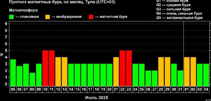 ❗️Туляков ждет двухдневная магнитная буря: готовимся к ухудшению самочувствия Жителей Тулы предупреждают о затяжной магнитной буре, которая накроет регион 10 и 11 июля. По данным лаборатории рентгеновской астрономии Солнца, в эти дни ожидается возбужденная магнитосфера уровня G1, что может вызвать недомогание и мигрень у метеозависимых людей. Врачи рекомендуют в эти дни больше отдыхать и избегать физических нагрузок. Следующее геомагнитное возмущение ожидается лишь в конце июля