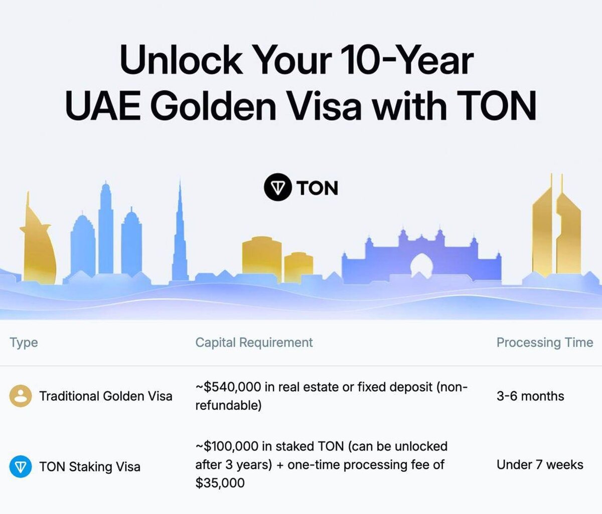 🇦🇪 Золотая виза в ОАЭ за TON Владельцы криптовалюты TON теперь могут оформить 10‑летнюю золотую визу в Эмиратах. Всё официально: соглашение подписано с правительством ОАЭ, сообщили на сайте TON. Условия: — Заморозить $100 000 в TON на своём счёте; — Держать три года без вывода; — Подождать 7 недель и добро пожаловать в Дубай. На фоне новости TON подскочил в цене на 12%. Когда-то за паспорт надо было быть шейхом. Теперь достаточно быть холдером. Эмираты, как всегда, в тренде. 🚲 Подпишись на Телега Online