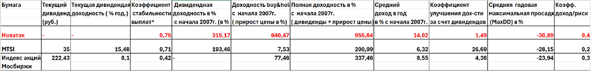 В таблице 1 приведены, как и в предыдущем исследовании по МТС, показатели исторической дивидендной доходности, доходности «buy&hold» от прироста цены, показатели стабильности выплат дивидендов и рыночного риска. Вся статистика приведена с января 2007 г. В таблице, кроме данных по Новатэку (они выделены красным цветом) приведены цифры по индексу акций Мосбиржи. Цифры по МТС из прошлого обзора я тоже привел, для сравнения. Конечно, сравнивать две акции из принципиально разных отраслей экономики- несколько странно, но если мы считаем их инструментами для получения долгосрочного дивидендного дохода, то почему бы не сравнить с этой точки зрения? В дальнейшем этот список будет пополняться за счет других российских дивидендных бумаг, и действительно, будет что сравнить. В отличие от МТС, по Новатэку нет показателя ближайшего дивиденда и текущей дивидендной доходности, которую можно получить уже сейчас, поскольку промежуточный дивиденд за 2025 год по нему уже выплачен в мае текущего года. А по планируемой дивидендной выплате в октябре еще не утвержден ни размер, ни дата «отсечки». Поэтому тут сравнивать нечего. Начнем со стабильности выплат дивидендов. За них в таблице отвечает коэффициент стабильности выплат. О нем подробно я также рассказывал в предыдущем исследовании по акциям МТС. Чем ближе этот коэффициент к 1, тем стабильнее компания платит дивиденды и регулярно повышает их размер. Так вот, у Новатэка этот показатель гораздо выше среднерыночного (0.75 против 0,42) и даже несколько выше, чем у МТС, которая, как выяснилось из прошлого обзора, вполне себе может считаться дивидендной акцией на нашем рынке. Перейдем к доходности. А вот тут Новатэк удивил, и по сравнению с МТС. и по сравнению с индексом. Пассивная доходность «buy&hold» за восемнадцать с лишним лет составила 640,5%, что значительно выше среднерыночной доходности индекса 77,5% за этот же период. С МТС же вообще бессмысленно сравнивать, эта бумага, как мы уже знаем, почти не выросла за долгие 18 лет. И это при том, что Новатэк по стабильности выплат даже несколько лучше МТС (коэффициент стабильности выплат 0.75 против 0,71 у МТС). Получается, Новатэк, и без дивидендов исторически давал более-менее приемлемую доходность для инвестора. Но и дивиденды тоже вносили весьма приличную добавку в итоговую, полную доходность: они увеличили ее в 1,5 раза (коэффициент улучшения 1,49), до 955%. Это соответствует примерно 14% ежегодного дохода для инвестора, если считать по ставке сложного процента. Конечно, это не сравнить с влиянием дивидендных выплат на итоговую доходность МТС: как видно из таблицы, дивиденды подняли доходность МТС почти в 27 раз! (коэффициент улучшения 26,59). Но при этом. итоговая полная доходность для инвестора (дивиденды + рост цены) у МТС намного хуже, чем у Новатэка: примерно 6,32% ежегодного дохода по ставке сложного процента. В общем, как по стабильности дивидендов, так и по итоговой, полной доходности для инвестора получаем, что Новатэк намного лучше МТС и даже лучше рынка в среднем: итоговая полная доходность индекса Мосбиржи составляет 8,55% ежегодно по ставке сложного процента. Теперь поговорим и рисках. Рыночный риск измеряем с помощью показателя максимальной просадки (MaxDD). Подробно о том, что это за показатель, также было рассказано в предыдущей статье про МТС. Как видно из таблицы, этот показатель