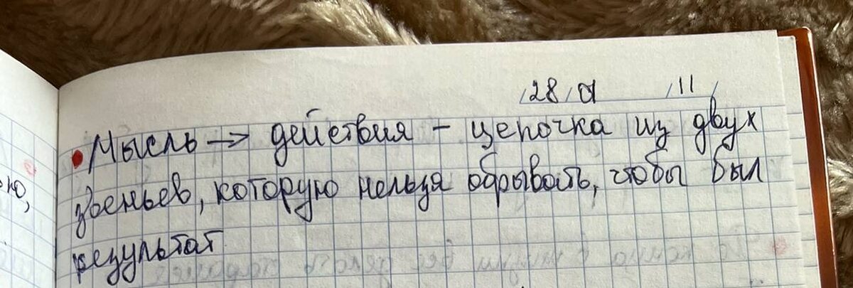 Мысль ➡️ Действия. Цепочка из 2 звеньев, которую нельзя обрывать, чтобы был результат. Сформулировал 28.01.11г. Это как будто позапозапрошлая жизнь, но истины остаются прежними. До сих пор пользуюсь.