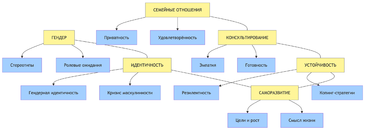 В области психологического консультирования накоплены многочисленные подходы. Классические модели – психоаналитическое, гуманистическое, когнитивно-поведенческое консультирование – дополнились современными интегративными направлениями (напр., когнитивно-аналитическая терапия, транстеоретическая модель изменений Дж. Протаски и К. Ди Клементе и др.). В социальной психологии особое развитие получила системная терапия семьи (М. Боуэн, В. Сатир, С. Минухин и др.), а также практики краткосрочного консультирования, ориентированные на решение (С. Де Шейзер). Тем не менее, теоретическое осмысление консультативного процесса продолжает сталкиваться с разобщенностью понятийного аппарата и полярностью методов. Суворова в своем исследовании деятельностно-психологического консультирования подчеркивает, что до сих пор отсутствует единство в понимании предмета, целей и способов психологического консультирования, что сужает возможности продуктивного диалога специалистов. Отдельные аспекты нашей проблемы разрабатывались в диссертационных работах: например, Храмова (2003) изучала формирование психологической готовности студентов-психологов к консультированию по проблемам супружеских отношений, предложив структуру готовности и программу ее развития у будущих специалистов. В ее введении отмечается, что современная семейная ситуация характеризуется множеством проблем (детские девиации, неврозы), коренящихся в дисфункции семьи, а отсутствие позитивного эталона брака в массовом сознании осложняет сохранение семьи. Храмова обосновала необходимость подготовки консультантов к превентивной помощи супругам и выделила компоненты готовности: мотивационный, когнитивный, эмпатийный и др. Также ею подчеркнуто, что консультирование супругов – это во многом просвещение и стимуляция их самостоятельной работы над отношениями. Дамаева (2013) затрагивала в своей докторской работе психологию гендерного развития личности (на примере спортсменов), что смыкается с нашей тематикой в части гендерных особенностей самореализации личности. Бендас (2002) исследовала гендерные и этнические аспекты психологии лидерства – ценный фон для понимания половых стереотипов и ролевых ожиданий, влияющих и на интимные отношения. Ожигова (2006) сконцентрировалась на гендерной идентичности личности и смысловых механизмах ее реализации, затронув кризисы идентичности, которые могут отражаться и в отношениях (например, кризис маскулинности или фемининности, обсуждаемый Клециной). Наконец, Зверева (2005) изучала развитие интеллекта в контексте гендерных различий, делая акцент на адаптационных возможностях личности – что перекликается с идеей устойчивости.