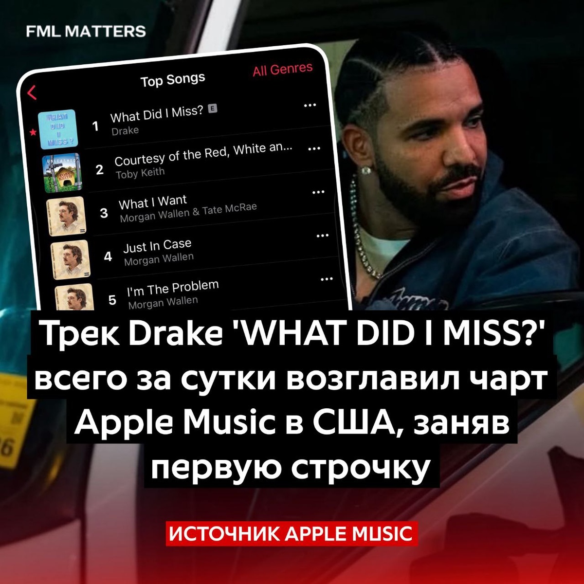 В ответ на пост 📈 DRAKE РВЁТ ЧАРТЫ С НОВЫМ ТРЕКОМ! Трек Дрейка «WHAT DID I MISS?» занял первое место в чарте Apple Music США. Сейчас у Дриззи сразу две самые высокие позиции среди хип-хоп треков на платформе — это «Nokia» и «WHAT DID I MISS?» Послушать можно в нашем втором канале FML MUSIC Как вам трек? 🔥/🤡 💀 FML MATTERS