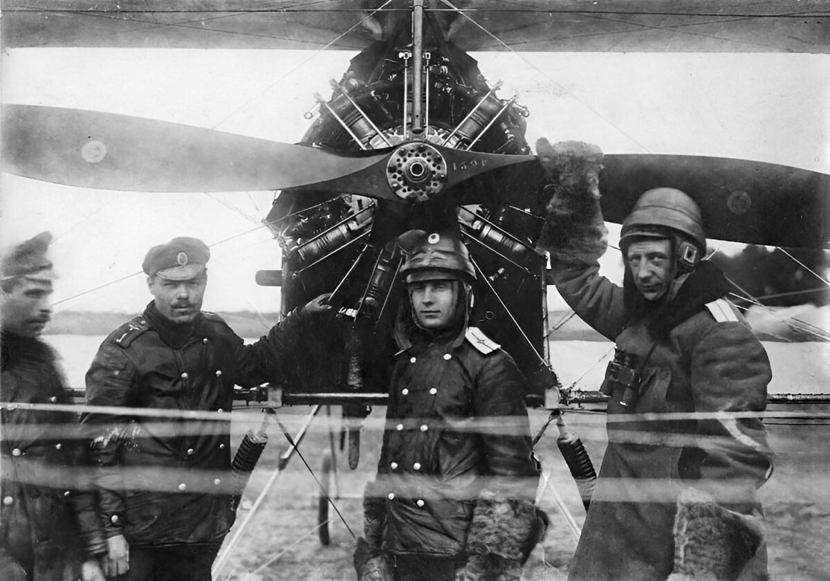 Экипаж двухместного французского бомбардировщика «Voisin V» и авиамеханики, 1916-1917 год
