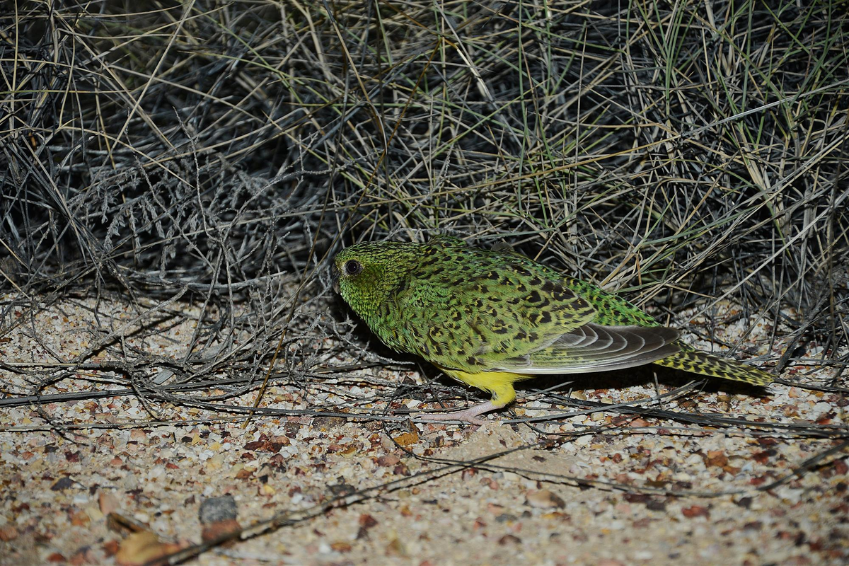 Ночной попугай (Pezoporus occidentalis) — один из немногих строго ночных попугаев в мире. Он обитает в засушливых и полузасушливых районах внутренней Австралии, где высокие кустарники спинакса, камыши и редкие травянистые заросли становятся для него и домом, и убежищем, и театром теней, в котором он растворяется почти бесследно.