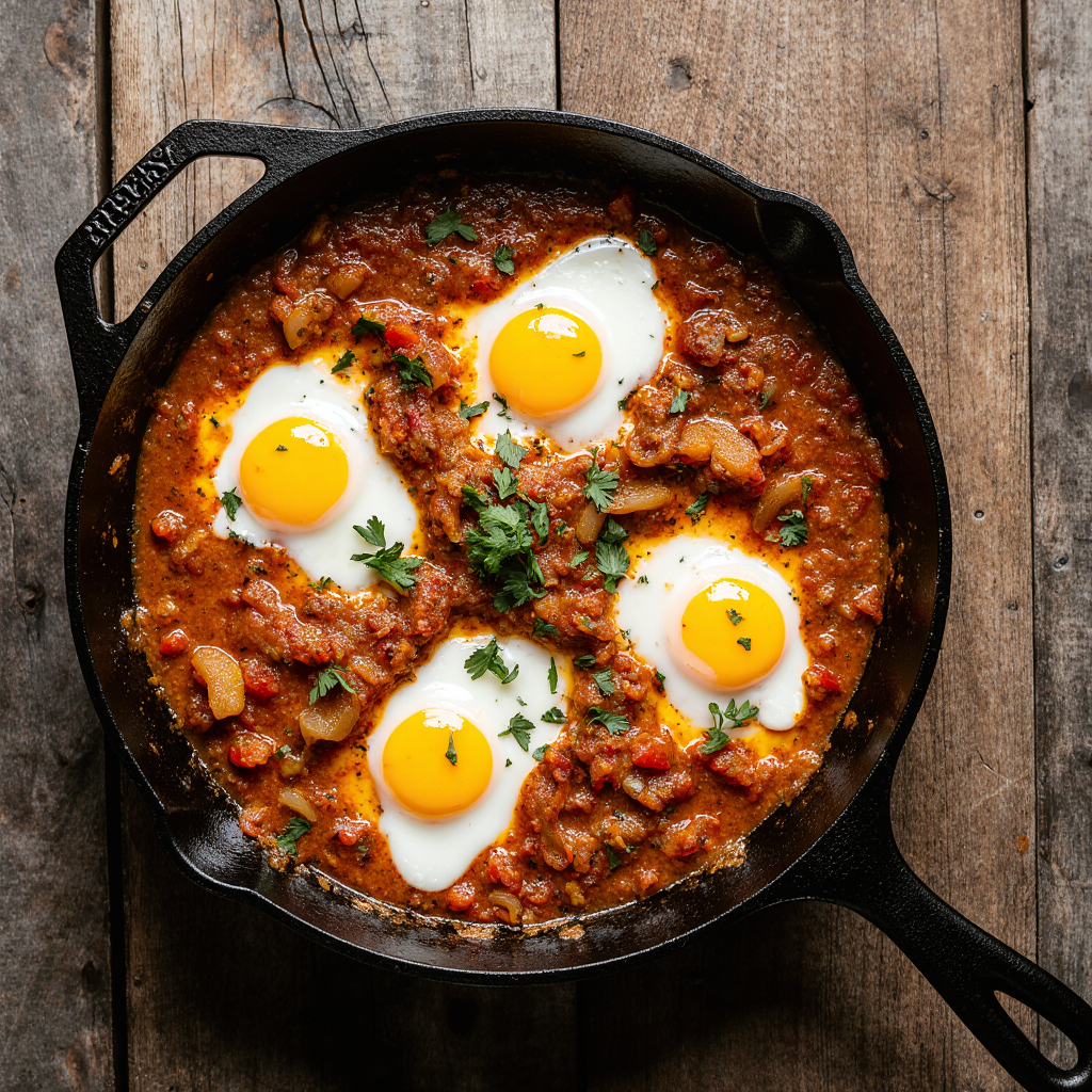Яркий завтрак из томатов и специй.Ингредиенты: 3 яйца · 400 г томатов в собственном соку · перец · лук · паприка.Шаги: