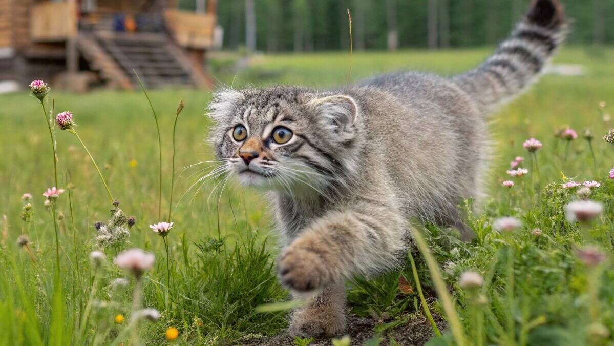Манулёнок Дашка замерла на крыльце, настороженно принюхиваясь к незнакомым запахам степей. Её пушистый хвост нервно подрагивал, уши были прижаты к голове — верный признак тревоги.