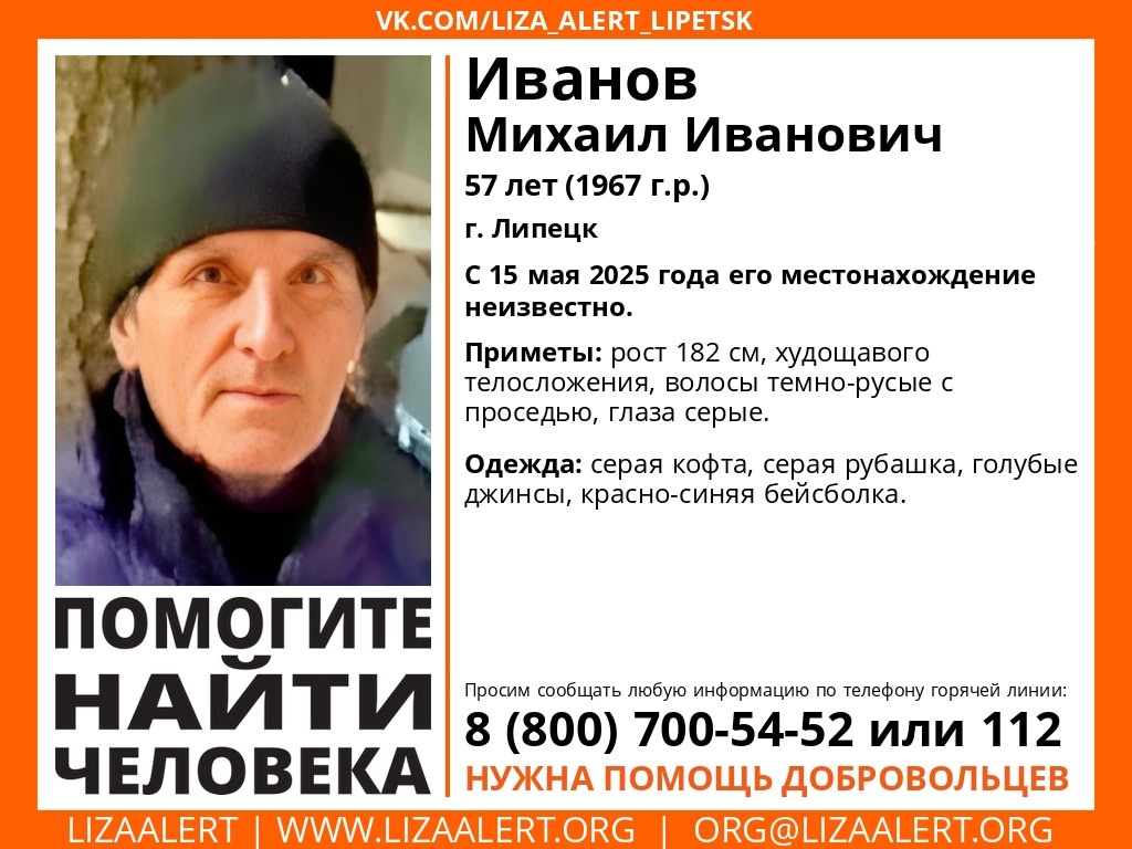 В Липецке полиция и волонтеры разыскивают пропавшего 57-летнего Михаила Ивановича Иванова. Мужчина ушел из дома в областном центре еще 15 мая. С тех пор о его местонахождении неизвестно. Об этом сообщили в поисковом отряде «Лиза Алерт» Липецкой области. Приметы 57-летнего мужчины: рост 182 см, худощавый, волосы темно-русые с проседью, серые глаза. Михаил был одет в серую кофту, серую рубашку, голубые джинсы. На голове — красно-синяя бейсболка. Если вы обладаете какой-либо информацией о пропавшем липчанине, просьба позвонить по номеру телефона горячей линии отряда «Лиза Алерт» — 88007005452 (бесплатно по РФ) или 112.