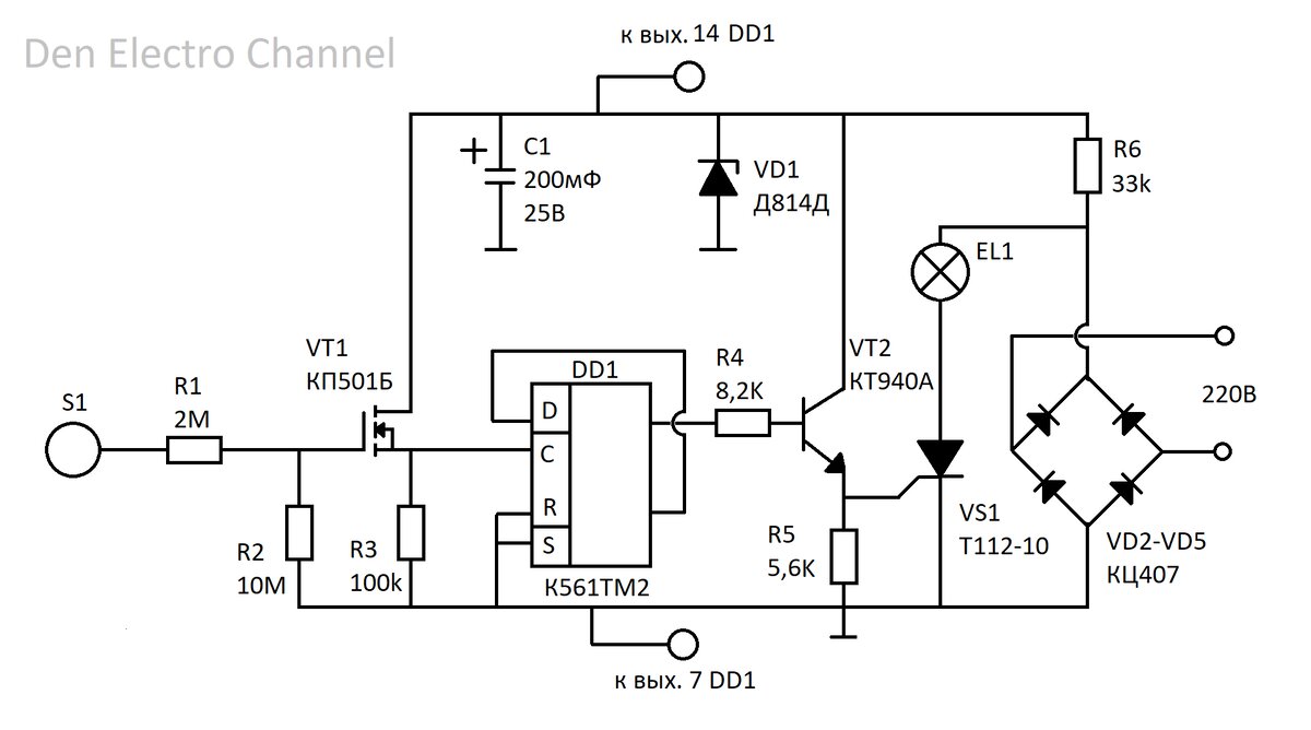 В этой статье мы подробно разберем, как функционирует интересное сенсорное устройство с триггером, предназначенное для управления любой нагрузкой на 220 Вольт (например, лампой накаливания), с помощью простого прикосновения. Эта схема отличается простотой и высокой надежностью. Принцип работы устройства Данное устройство работает по принципу бистабильного триггера, что означает, что оно имеет два устойчивых состояния: "включено" и "выключено". Время нахождения в каждом состоянии не ограничено, пока на устройство подано питание 220 Вольт. Схема позволяет включать лампочку (или любую другую подключенную нагрузку) одним прикосновением к сенсорному контакту. Лампочка останется включенной до тех пор, пока вы не прикоснетесь к сенсору повторно. Второе прикосновение переведет устройство в другое устойчивое состояние, и лампочка выключится. Триггерный узел: Сердцем устройства является триггер, собранный на классической логической микросхеме DD1 (К561ТМ2). Вывод 1 микросхемы (выход) подает упр