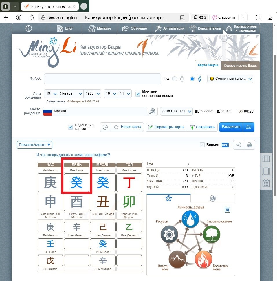 Рассчитайте свою карту Бацзы на любом онлайн-калькуляторе (например, mingli.ru/bazi).