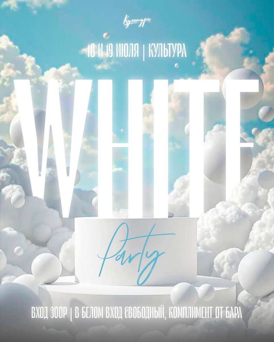 Главное событие лета – WHITE PARTY в Культуре 🤍 Легендарная, по-настоящему летняя вечеринка продлится целых два дня: 18 и 19 июля. На веранде после 20:00 всех гостей в белом будет ждать комплимент от бара и диджей-сет. В клубе гостей в белом ждёт бесплатный вход и комплимент от бара. Для остальных вход – 300₽. За музыку в клубе отвечают: Zaycev, Salavat, Shiromi, Desh. Готовьте белый наряд и до встречи в Культуре 🤍
