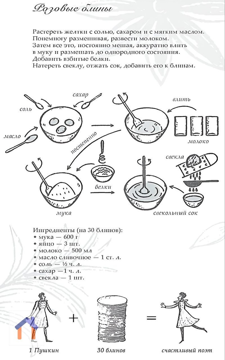 Розовыми блинами баловала своего воспитанника няня Арина Родионовна. Фрейлина А. Смирнова писала: "Пушкин съедал их 30 штук, после каждого блина выпивал глоток воды и не испытывал ни малейшей тяжести в желудке".