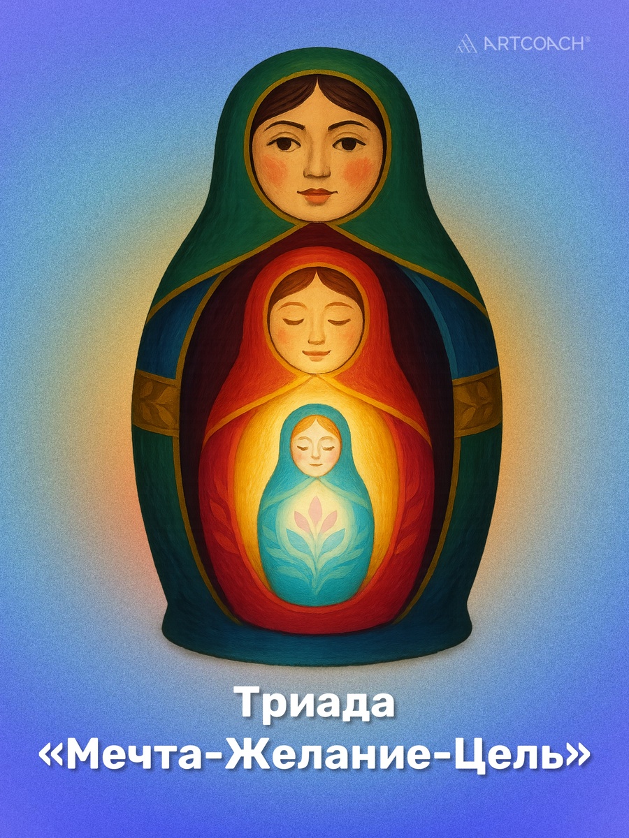 Авторская модель «Триада Мечта – Желание – Цель» представляет собой метафорическое и системное описание движения человека от внутреннего импульса к внешнему действию. Визуально модель представлена в виде трёхуровневой матрёшки, где мечта — это внутренняя, тонкая сущность, желание — связующее эмоциональное звено, а цель — внешняя форма реализации.