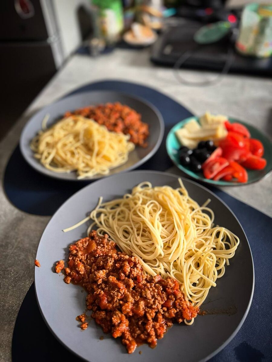 #идеяужин@zhizn_z 🔵Спагетти болоньезе (фарш, помидоры) 🔵нарезка (помидор,сыр, маслины)