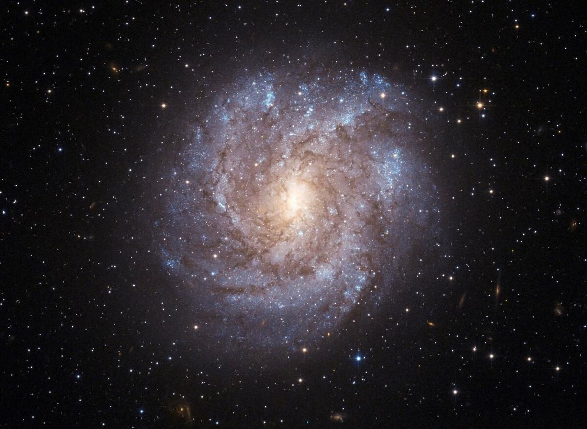 Спиральная галактика NGC 2082, расположенная в 60 миллионах световых лет от нас, поражает своим великолепием. Снимок, сделанный с помощью усовершенствованной обзорной камеры Hubble, демонстрирует NGC 2082 в мельчайших деталях – нити тёмной космической пыли пронизывают спиральные рукава галактики и её центральное скопление звёзд. Более того, Hubble позволяет разглядеть отдельные звёзды внутри галактики, а также крошечные далёкие галактики на заднем плане. Описание изображения: В центре снимка доминирует спиральная галактика с жёлтым ядром и размытыми рукавами, наполненными тёмно-коричневой пылью и яркими голубыми звёздами. Чёрный фон космоса усыпан звёздами и более удалёнными галактиками.