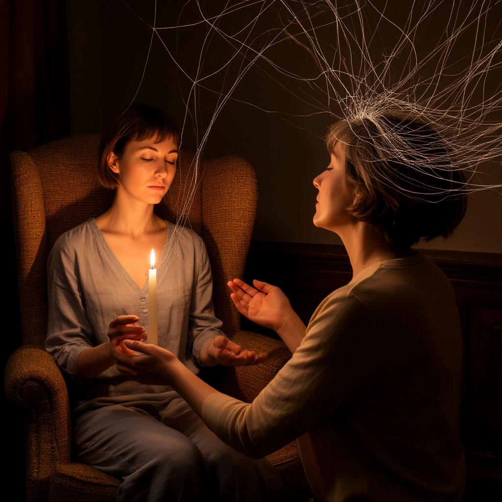 Валя велела мне удобнее устроиться в кресле и закрыть глаза. Предупредила, что если начнет кружиться голова, появится тошнота или другие странные ощущения, то нужно будет потерпеть. Руки попросила положить на колени ладонями вверх, сама зажгла свечу и встала за моей спиной. Комната наполнилась тихой молитвой. Слова меня окутывали, убаюкивали, увлекали за собой. В голове появилось ощущение пустоты, отрешенности от всего мира. Остался только голос Валентины, читающий молитву. В какой-то момент я почувствовала, что меня укачивает, какая-то сила меня тащила за собой. Все стало неважно, словно подернулось дымкой, и я увидела, как из моих ладоней вышли серебристые нити и потянулись в сторону Валентины. Мой мозг отказывался принимать то, что я видела. Я сидела с закрытыми глазами и видела. Умом я понимала, что это невозможно, но нити никуда не пропадали. Наоборот, они стали толще, длиннее. Я не помню, сколько продолжалась отчитка, но в какой-то момент я услышала запах ладана, а нити стали тер