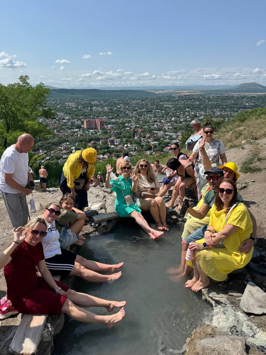 Кинезиотуризм-2025 День 6 С утра мы поднялись на гору Машук, один из символов Пятигорска. Подошли к Провалу, где нас встретил памятник очень известному герою. Ещё мы побывали в бесстыжих ваннах (которые однозначно приятнее посещать в более прохладную погоду). На вершине Машука мы провели торжественный процесс: нарисовали и повесили табличку «Кинезиотур 2025». После обеда, по дороге в горы, мы побывали на термальных источниках и искупались там. К вечеру мы приехали в волшебное место на берегу Нижнего Голубого озера, дно которого продолжают исследовать специалисты, на данный момент обозначенная глубина составляет почти 800 метров. А завершили день мы, наполненные новыми впечатлениями, у Верхнего Голубого озера 💚🏔