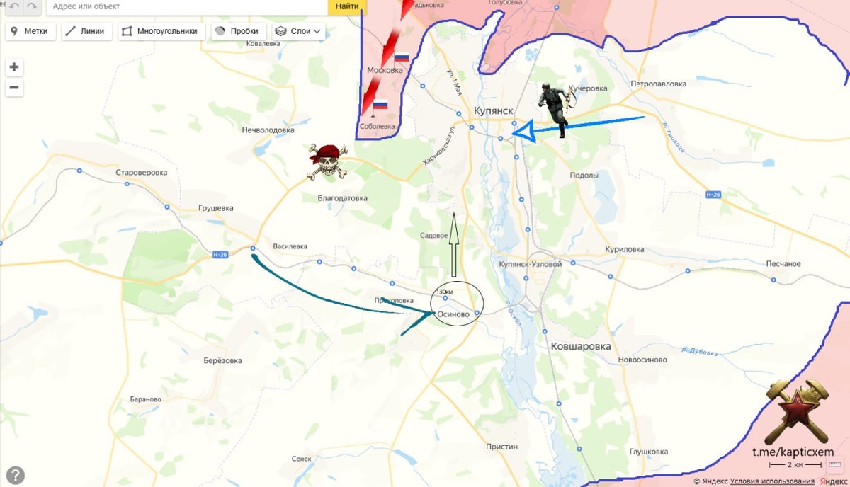 В ответ на пост Северное предполье Купянска. Взлом оборонительных рубежей (блестящее продолжение) После взятия Московки, падает оборона противника и в Соболевке. Наше Министерство обороны сегодня об этом неожиданно объявило. ВС РФ не стали добивать гарнизон ВСУ в Голубовке (рубеж предполья №1) и взламывать с севера внешний контур обороны Купянска. А пошли другим путем - режут оборону Купянска по периметру с охватом, удушая логистику. Взятие Соболевки позволяет нам полностью контролировать трассу Н-26. Теперь, все потоки снабжение очень крупной Купянской группировки ВСУ пойдут автотранспортом через авто- железнодорожный узел и инфроструктуру станций 130км-Осиново. Косвенно, большие проблемы Купянской группировки подтверждается началом вывода в июне с восточного берега Оскола ремонтных и вспомогательных частей, а теперь источники с мест сообщают об отходе и линейных подразделений. Имеет ли это массовый спланированный и необратимый характер, время покажет. Картографы пока не красят за