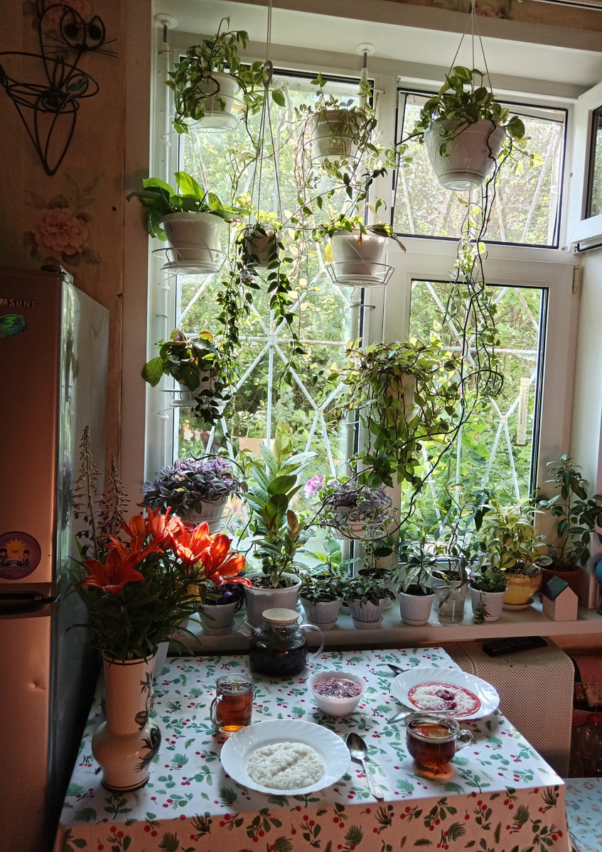 Фотографировать не стала. Все цветы в пыли. Скатерть вытряхивала на улице. Менять скатерь нет смысла. Завтра ещё грязнее будет. Штробить будут.