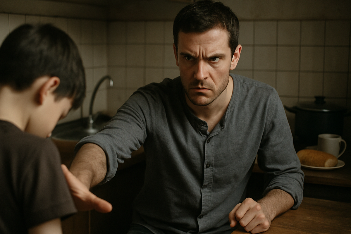 — Сначала моя мама поест, а потом твой убогий сынок сядет жрать! — рявкнул Сергей, грубо оттолкнув Максима, когда тот попытался взять кусочек хлеба.