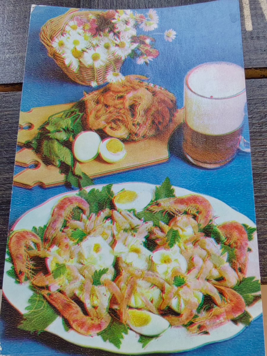 Вторая часть тут: Это открытки 1980 года, качество конечно не очень. Про подобный шницель никогда не слышала, более того, такого рецепта не встречала ни в одной старой кулинарной книге. Воз одно его подавали в некоторых приморских ресторанах, не знаю. По сути те же котлеты, но приплюснутой формы. Узбекская кухня: Суп с грибами и креветками. Ну не знаю...Возможно, что найдутся любители. Узбекская кухня, 1973 г Блюда литовской кухни, 1974 год: Хотя фото и очень старое, но выглядят рулетики очень аппетитно. Примерно так же готовят в Египте в рыбных бистро и ресторанах, только вместо сметаны сливки и морковку не добавляют. Мой муж очень часто заказывает это блюдо или готовит дома. Открытка 1972 года: Что-то на фото одно, а в рецепте другое. Я сперва вообще подумала, что это борщ. В рецепте почему-то нет томата. Это из набора "Блюда грузинской кухни". Другие открытки куда-то подевались. Мойву пряную очень люблю. Нужно будет обязательно ее купить.