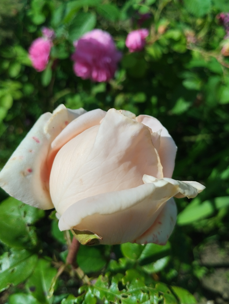 В эти выходные раскрылись два бутона моей любимицы - кремовой розы Осеана. Листья у нее успели пожевать тли, но после обработки новых врагов я не нашла. Ещё радует малышка почвопокровная розочка.