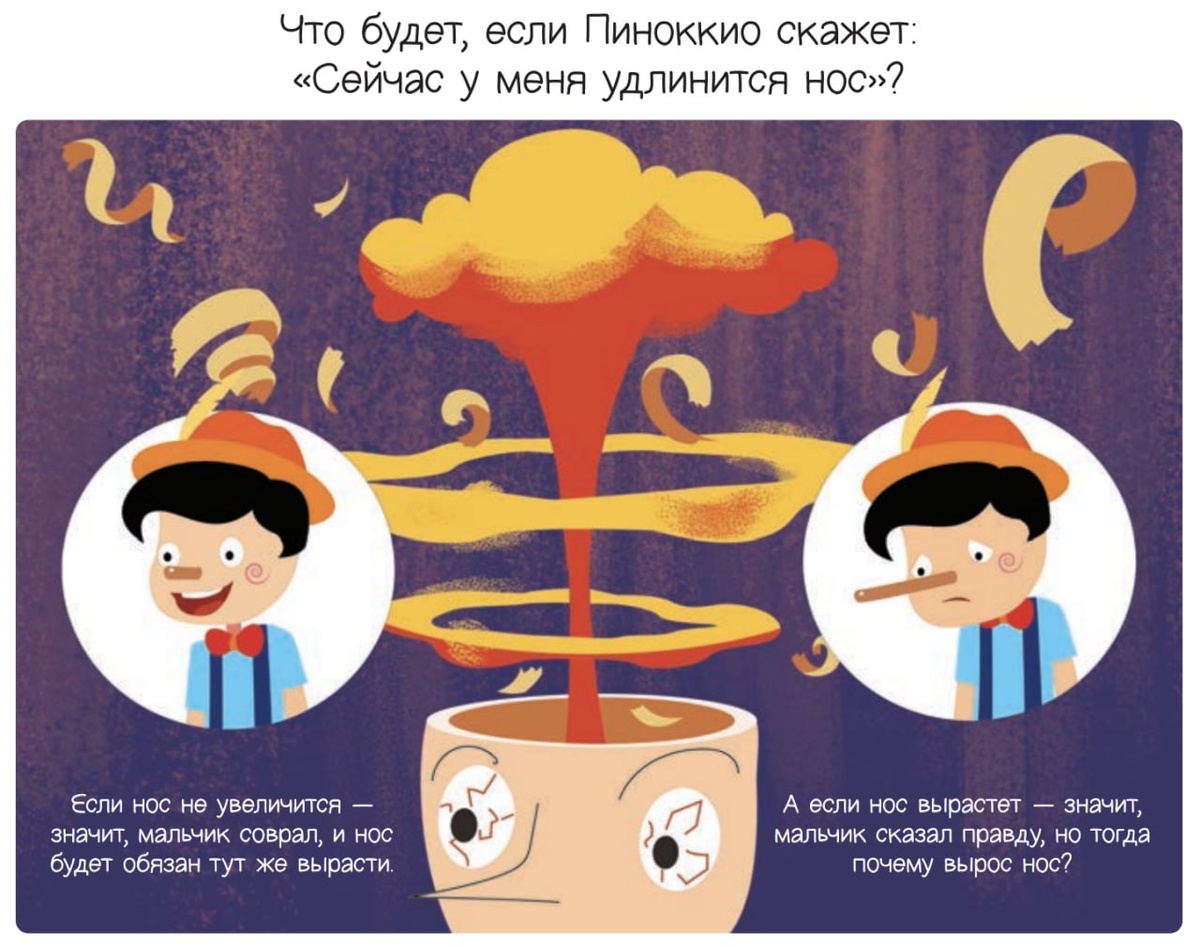 Правдивый лжец Ещё в древние времена учёные и философы заметили, что есть утверждения, которые противоречат сами себе. Это не загадки, потому что у них нет разгадок. Подобные утверждения называют парадоксами. Один из самых известных и древних парадоксов — «Парадокс лжеца». Допустим, некто утверждает: «То, что я сейчас говорю, — ложь», или короче: «Я лгу». Истинно или ложно это его утверждение? Предположим, оно истинно, то есть, говоря: «Я лгу», человек говорит правду. Но раз он говорит правду, то, значит, его утверждение «Я лгу» ложно. Получается, что если утверждение истинное, то это приводит к тому, что оно ложно. А теперь предположим, что его утверждение ложно. Значит, утверждая: «Я лгу», он обманывает. Но тогда выходит, что он на самом деле лжёт, и его утверждение «Я лгу» истинное. Теперь получается, что наше предположение о том, что утверждение ложно, приводит к тому, что оно истинное. Как ни крути, такое утверждение приходится признать и истинным, и ложным, причём одновреме
