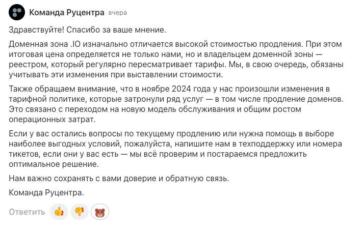 📬 Недавно писал, что перевожу домен в Timeweb. Видимо, у nic.ru стоит мониторинг репутации — и вот, в лучших традициях корпораций, прилетело вежливое, но странное письмо: : "У нас подорожание, потому что… ну, вы же понимаете — рост затрат, реестр поднял, тарифы пересмотрели..." 🔎 Ага. Только домен .io теперь стоит в 4 раза дороже, чем в других регистраторах. И это не просто «выросли расходы» — это уже какой-то новый класс роскоши. 💭 Спросить "почему" — получил длинное письмо, где ни слова по сути: – Ссылаются на реестр (но он не в 4 раза поднимал). – Ссылаются на изначально дорогую зону (но другие регистраторы в ней не взлетели). – Говорят про «модель обслуживания» — но что она даёт, кроме цены? 😕 От ответа легче не стало. ❌ Не объяснили, почему дороже. ✅ Только подтвердили, что действительно дороже. 📦 Я домен уже перевёл. Но всё ещё жду тот день, когда крупные компании будут говорить проще и честнее: «Да, зарвались. Ушли в отрыв. Понимаем, если уйдёте.» 👉 Александр Андрее