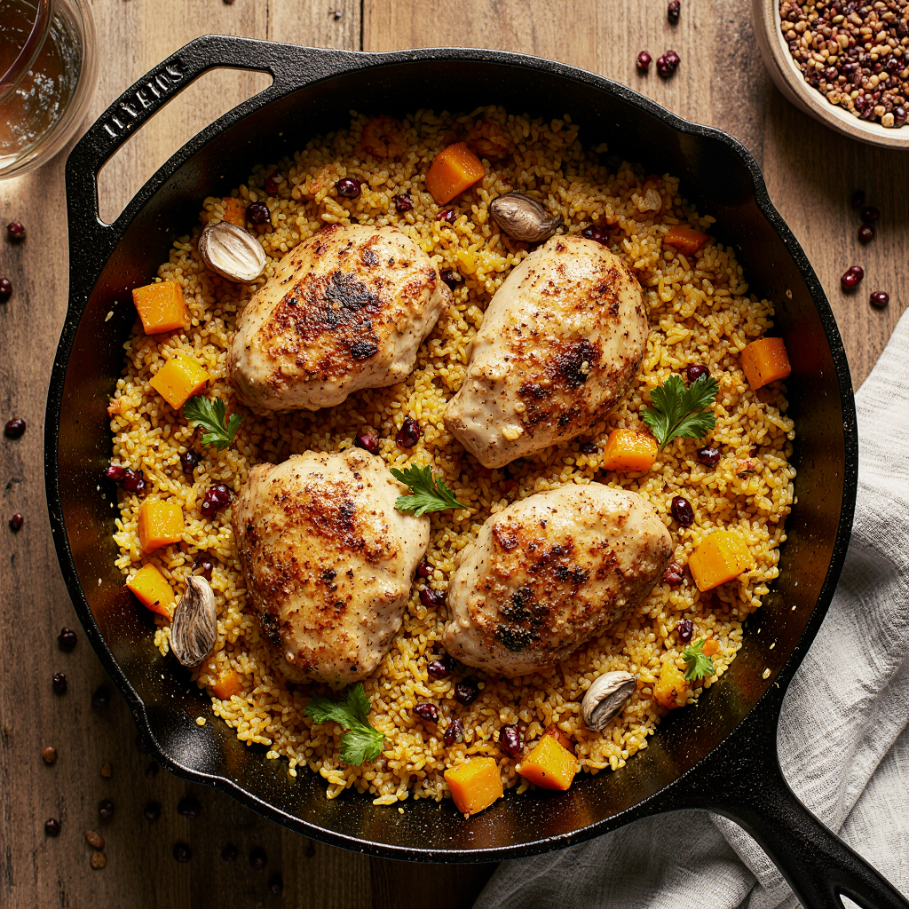 Вкус узбекской кухни за полчаса.Ингредиенты: 2 куриных бедра без кости · 1 стакан риса · лук · морковь · зира.Шаги:
