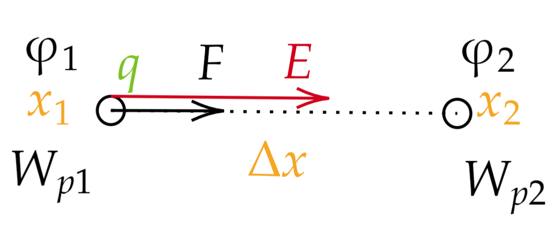 Две основные характеристики электрического поля: 1. Потенциал (φ) - энергетическая характеристика поля; 2. Напряженность (E) - силовая характеристика поля. Подробнее о напряженности - в отдельной заметке. Сейчас разберем потенциал и напряжение. Рассмотрим перемещение заряда q >0 из точки x₁ в точку x₂: - Потенциальная энергия в точке 1: Wₚ₁ - Потенциальная энергия в точке 2: Wₚ₂ ΔWₚ=Wₚ₂-Wₚ₁ Работа поля: A = Wₚ₁ - Wₚ₂ = -ΔWₚ (Поле тратит потенциальную энергию, совершая работу.) Связь силы, работы и потенциала: На заряд q действует сила: F = q·E Работа этой силы: A = F·Δx = q·Eₓ·Δx, где Δx = x₂ - x₁ Таким образом: -ΔWₚ = q·Eₓ·Δx Важные моменты: Wₚ₁ = -q·Eₓ·x₁ + C Wₚ₂ = -q·Eₓ·x₂ + C Разность Wₚ₁ и Wₚ₂ от выбора нулевого уровня не зависит. Потенциал: φ = Wₚ / q Если подставить выражение для потенциальной энергии, то: φ = ( -q·Eₓ·x+ С) / q Таким образом: φ= -Eₓ·x + С Введем понятие разности потенциалов: Δφ = φ₁ - φ₂ Разность потенциалов является абсолютной величиной, константы со