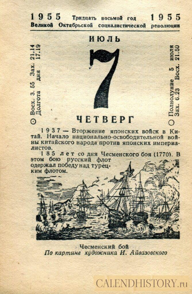Итак, сегодня 7-июля и у нас на календаре 1955-й год. Перед нами листок советского календаря Политиздата. На календаре у нас четверг - 7 июля 1955-го года. Чесменский бой