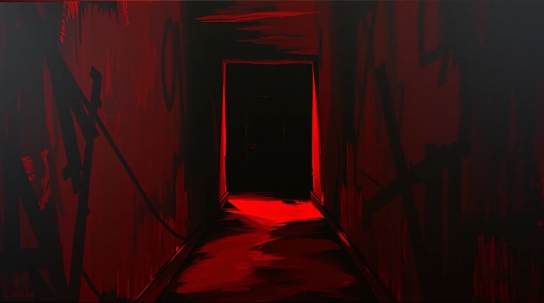 Я ощупала пол вокруг, чтобы понять, обо что споткнулась - это был ботинок, ткань которого затвердела от давно засохшей крови. Когда я в замешательстве подняла глаза, то понял, что вся комната изменилась - в воздухе витал запах старых вещей, плесени и отчаяния. Люстра висела под странным углом, сломанная и потемневшая за десятилетия забвения, стекло из разбитых и ныне заколоченных окон валялось на полу. Деревянный пол был деформирован и покрыт пятнами, а старые обои почти полностью отслоились. Чувство тоски, разрухи и печали разлилось по огромной комнате.