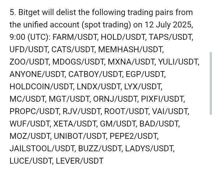 Туда эти тапалки 😈 12 июля биржа Bitget проведет делистинг мусорных тапалок: $TAPS, $PIXFI, $CATS, $MDOGS, $MEMHASH и $ZOO. Если у вас есть эти токены на бирже — продавайте или перекидывайте на кошелек, пока еще есть время. 👉Bybit (https://partner.bybit.com/b/43818) | Chat | Admin