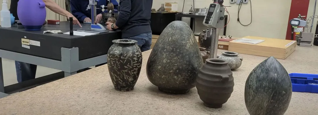 - Диаметр верхней части одной из ваз имеет разницу между осями X и Y около 4/10 микрона (0,000016 дюйма или 16 микроинчей), что можно приравнять к 1/100 толщины человеческого волоса.