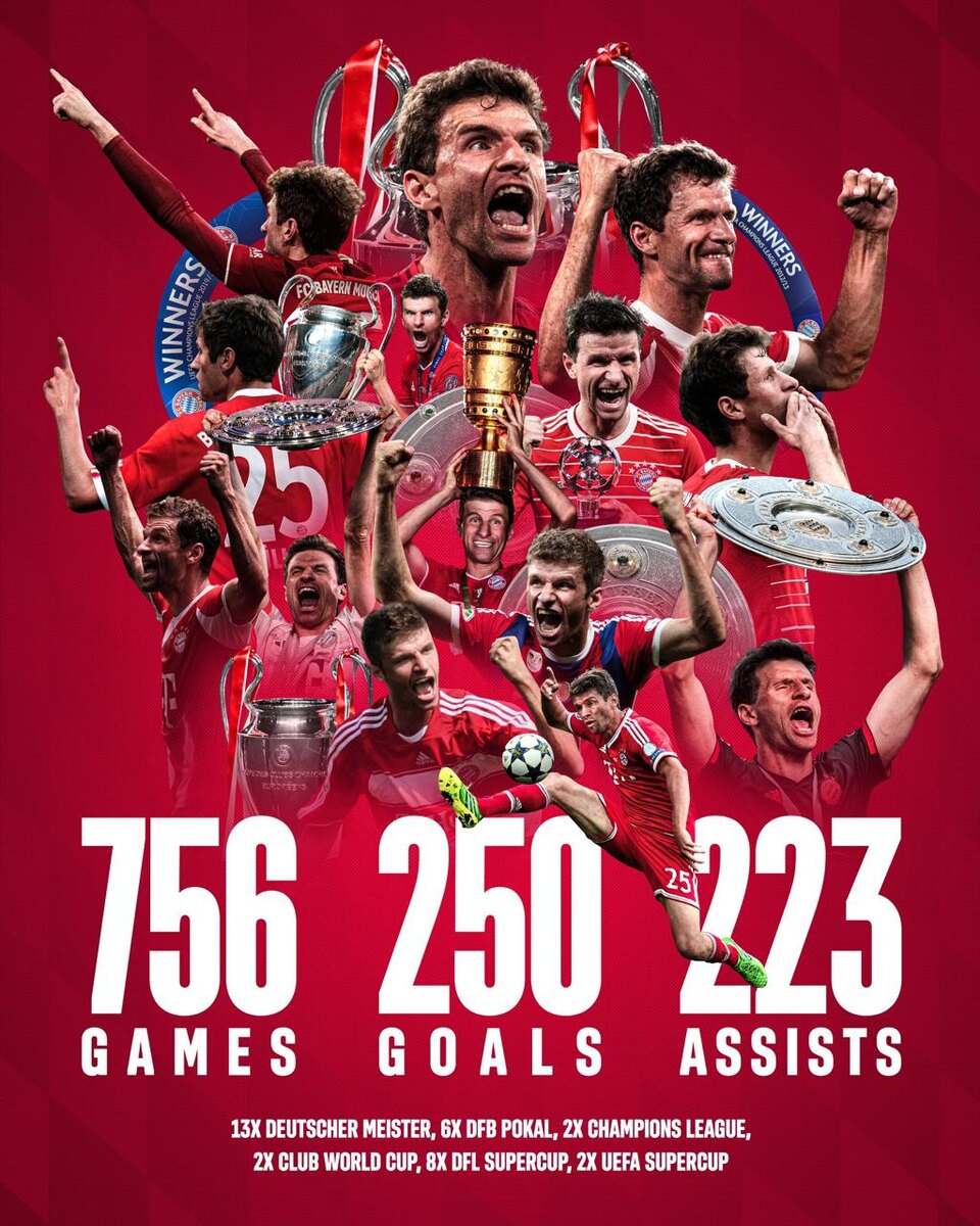 👏 «Бавария» попрощалась с Томасом Мюллером 35-летний нападающий завершил выступления за мюнхенский клуб. Он является воспитанником команды, за основу он дебютировал в 2009 году. Последний матч за «Баварию» он провёл в полуфинале клубного чемпионата мира против ПСЖ (0:2). «Карьера, не похожая ни на одну другую. Мы преклоняемся перед тобой, Томас!» — пишет клубная пресс-служба. В составе мюнхенцев форвард стал 13-кратным чемпионом Германии, шесть раз выиграл национальный Кубок и восемь — Суперкубок. Он два раза поднимал над головой трофей Лиги чемпионов, столько же выигрывал Суперкубок УЕФА. Мюллер — двукратный чемпион мира среди клубов. @russian_rt_sport