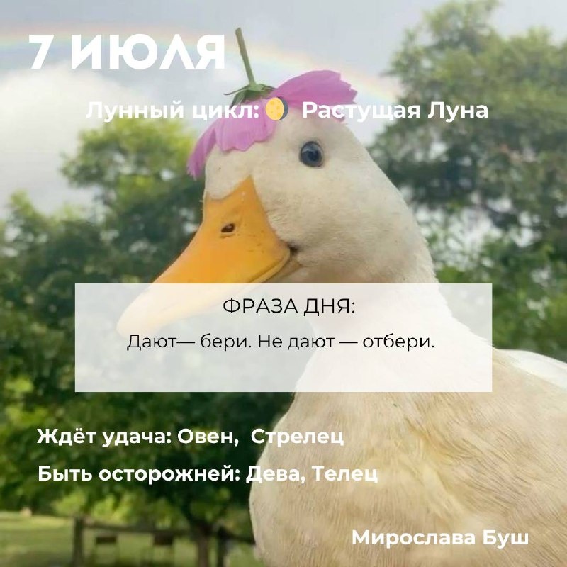 7 июля РЕКОМЕНДАЦИИ: В этот день граница между мирами становится тоньше. 💧Если пойдёт дождь или выпадет роса — это подарок. Пройдитесь босиком по земле или потрите руки свежесорванной мятой — так вы перенастроитесь на частоту изобилия. 💤Прежде чем лечь спать, загадайте вопрос и попросите сон-подсказку. Ответ может прийти через образ, запах или фразу. ✉️ Подписаться на Мирославу #прогнознадень